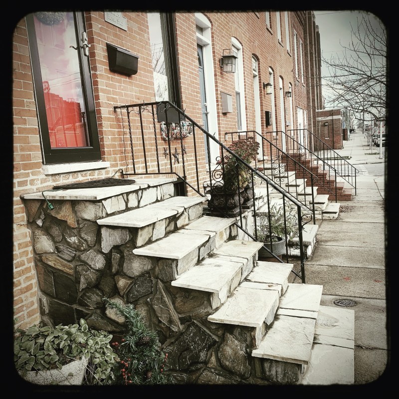 Baltimore is rich in tradition and there is nothing like the row houses. In the past shiny, white marble steps and freshly painted wrought iron railings were the mark of a well kept home. On Saturday morning the steps were scrubbed shiny and white. Every spring the railings would get a fresh coat of black lacquer. You don’t see that anymore but on a good day you can imagine the women out there scrubbing steps. I love living in Baltimore. That is a whole series that I am dreaming up. Stay tuned!